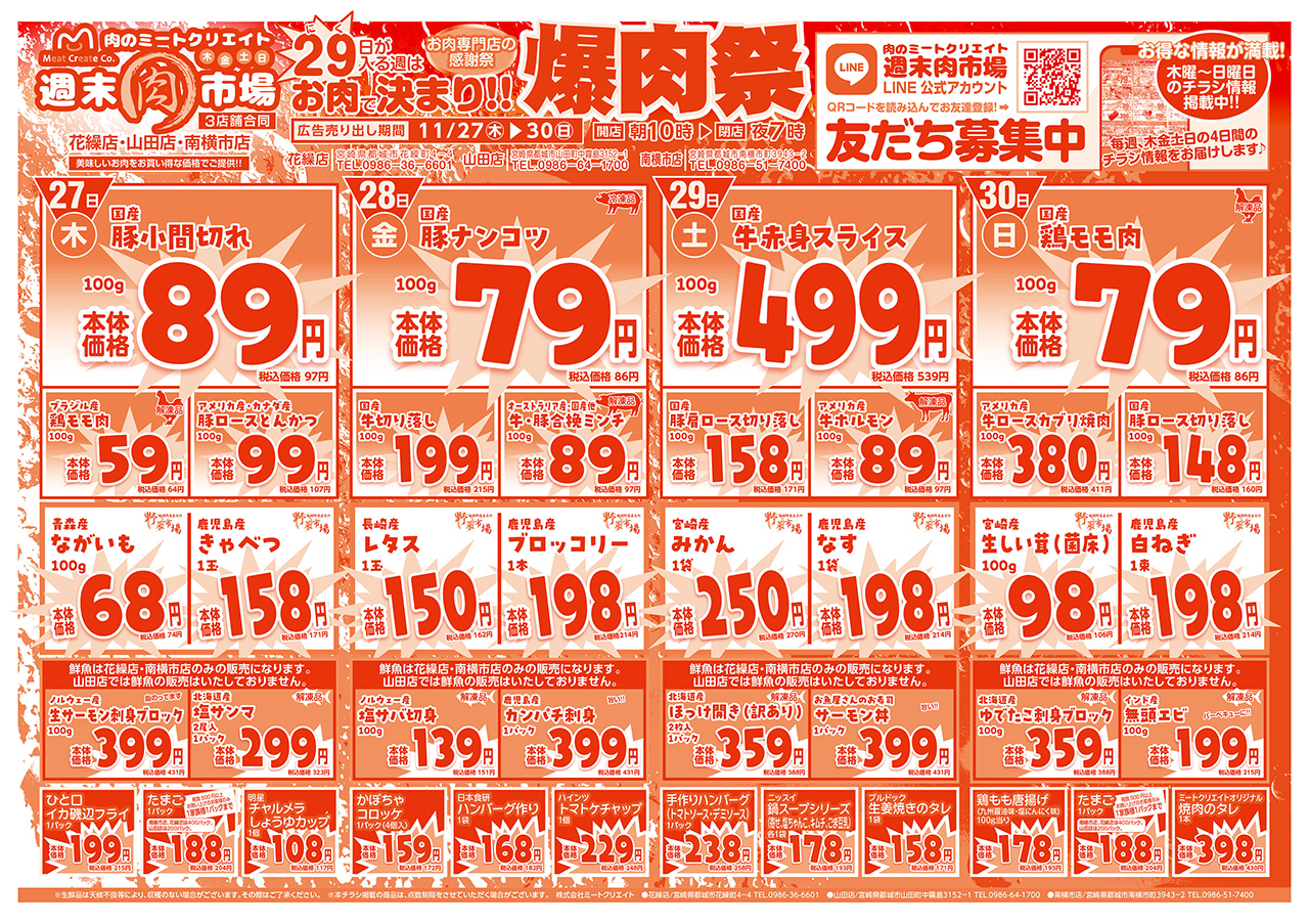 都城市山田町・花繰町にある「週末肉市場」さんは週末の木・金・土・日曜日の4日間のみ営業!新鮮なお肉はもちろん、手づくりのお惣菜やお弁当、野菜や果物など幅広い品揃えのお店です♪花繰店には鮮魚コーナーの「マリンクリエイト」もオープン致しました! |
