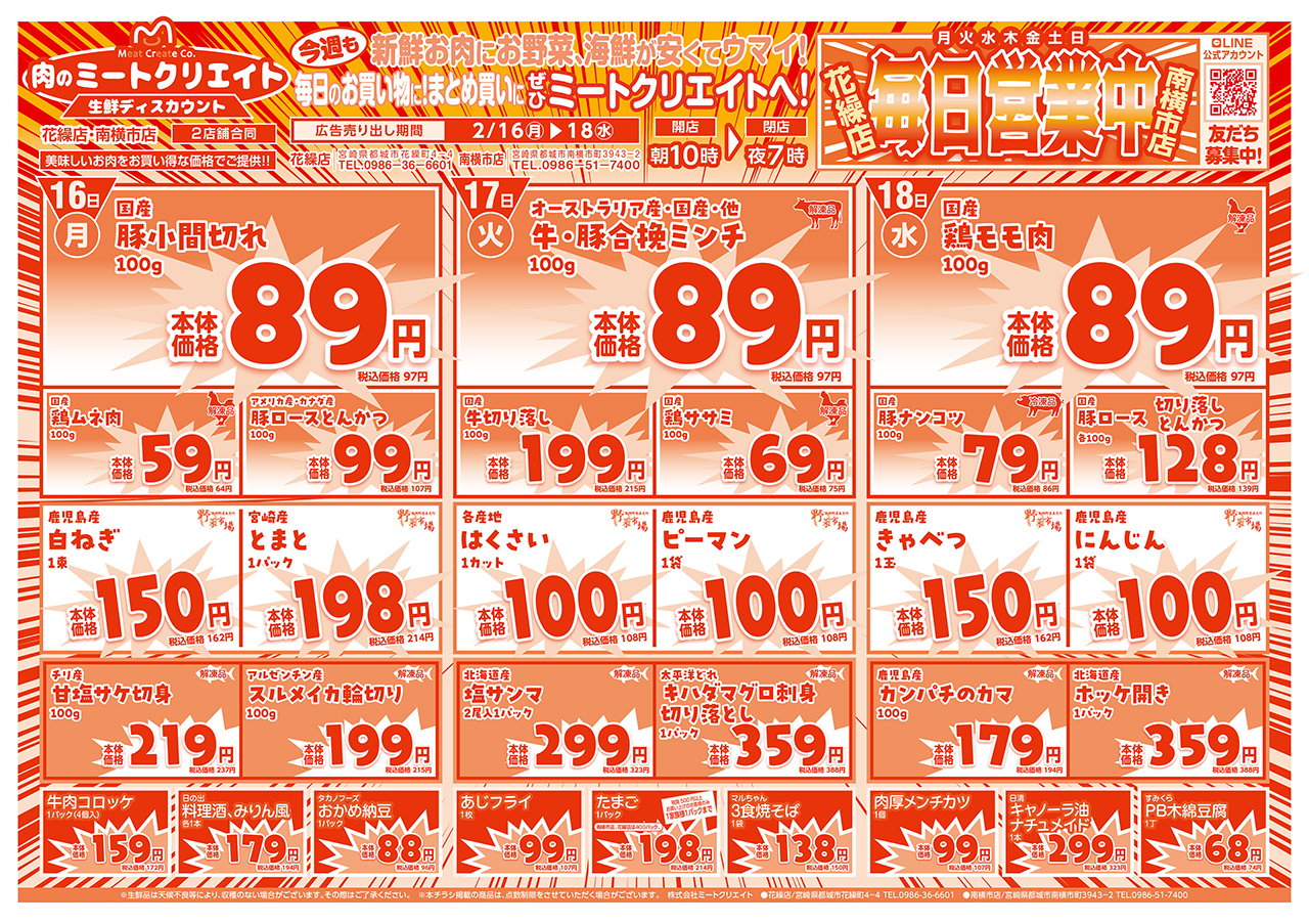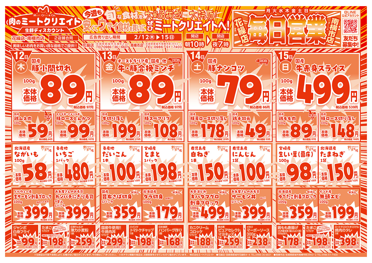 都城市花繰町・南横市町にある「肉のミートクリエイト」さんは 新鮮なお肉はもちろん、手づくりのお惣菜やお弁当、野菜や果物など幅広い品揃えのお店です♪ 2026年1月12日より毎日営業しております! 鮮魚コーナーの「マリンクリエイト」では新鮮な魚介類を豊富なラインナップでご用意しております☆ |