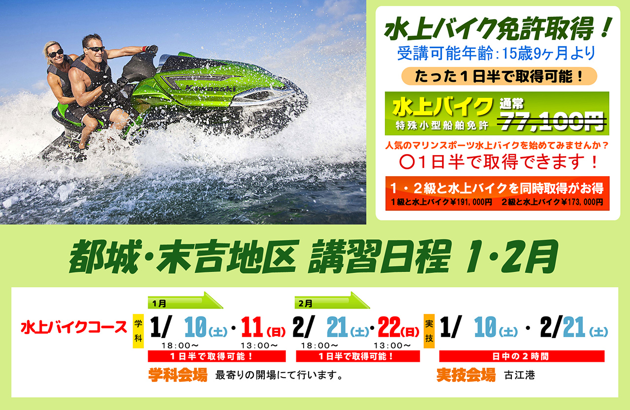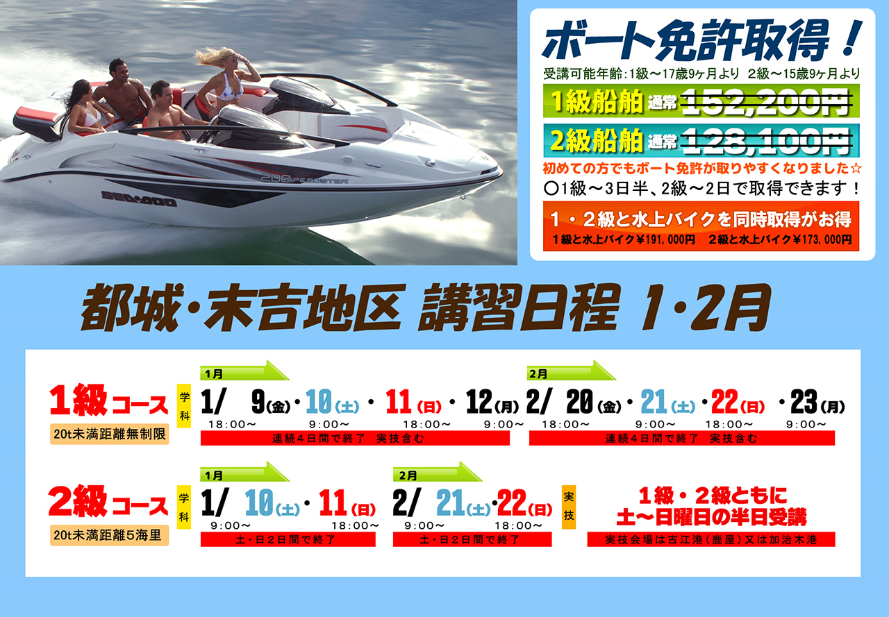 鹿屋市の「マリンスクール鹿屋海技」さんでは小型船舶免許や水上バイク(特殊小型)の免許を取得できます☆ 修了試験に合格すると難しい国家試験は免除♪ マリンレジャーとマリンスポーツを楽しみたい方は必見です! ボート免許を都城地区でも学科講習が受講できますよ〜! |