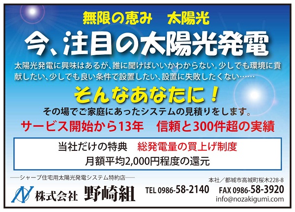 当社は、都城市を中心に宮崎県内各地で家作りをしています。施工:監修は野崎組ですので安心・安全な家作りが出来ます。 オアシスホームでは建築に伴う無駄を見直し、ローコスト(低価格)でありながら高品質の住宅を可能に致しました。標準の内容でもちろんOKです。もうちょっと欲張りたいと思われる方にはオプションもご提案できます。 予算に合った無理のない家作りはオアシスホームにお任せ下さい。 また、太陽光発電は施工実績が300件以上あり、設置から助成金の手続きなどすべて当社にて行います。 |