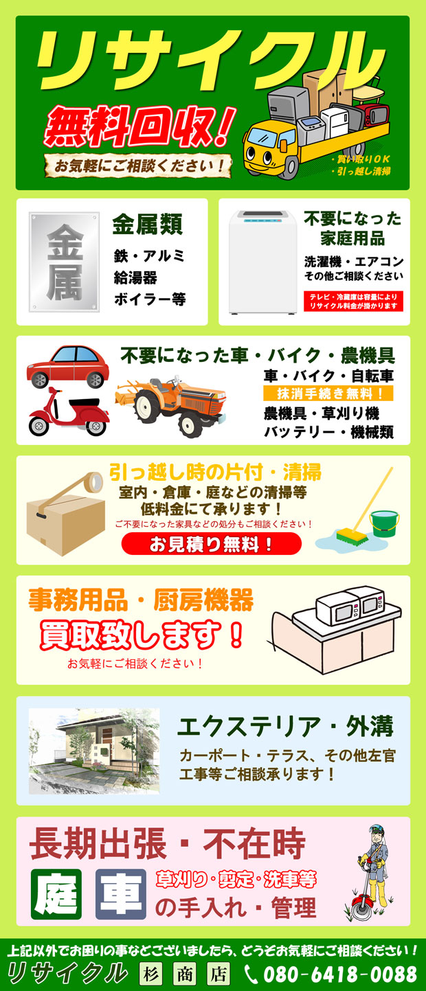 リサイクル杉商店さんでは、不要になった家庭用品や自動車・バイク・農機具など無料引き取りOK♪