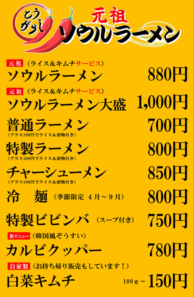 | 店 名 | 元祖ソウルラーメン とうがらし | ![]() |